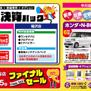 目玉車として、車両本体価格に登録諸費用とオプションが付いたお得な「大決算パック」をご用意。この他にも新車・中古車共にお値打ち価格でご提供します。さらに中川店では、マイカーリースで即納車可能なN-BOXの新車を数量限定でご用意しております。